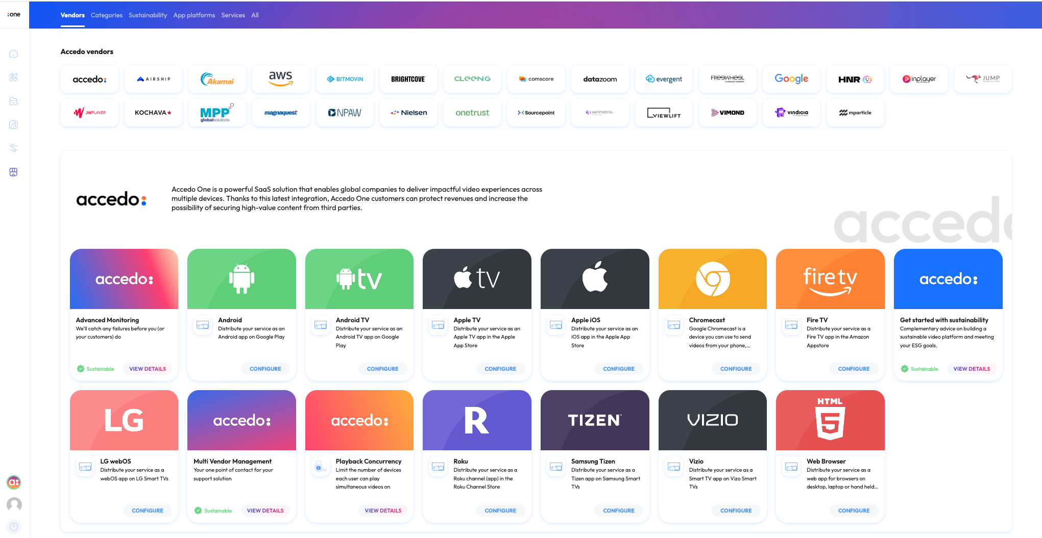 Brightcove Video Cloud is connected to Accedo One applications and can be enabled by a simple switch of a toggle in the Accedo One Marketplace. Add other vendors to your technology stack via the marketplace: CRMs, DRMs, analytics, personalization, marketing, monetization and more.