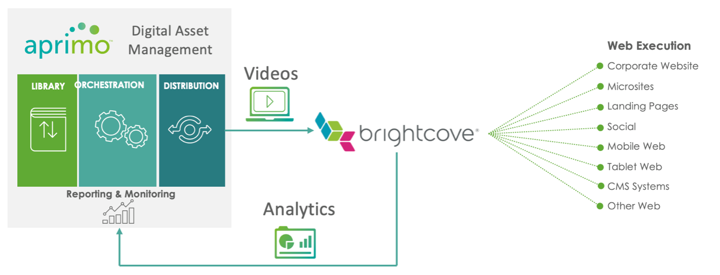The Aprimo DAM-Brightcove Connector integrates Aprimo with Brightcove allowing videos to be published to Video Cloud, providing the ability to sync videos and analytics every stage of the content lifecycle. The connector enables you to: