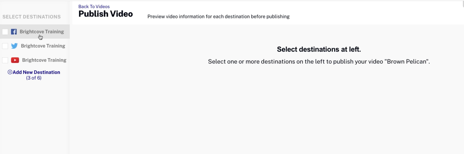 You must first create a Facebook destination when you want to publish videos to a Facebook page. Note that videos can only be distributed to Facebook pages, not personal profile pages.