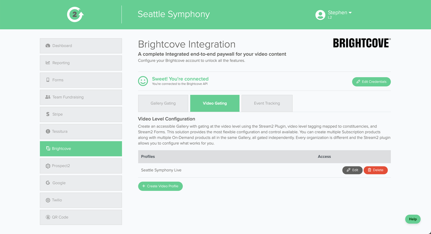 Our integration is a complete end-to-end solution to monetize and control access to Brightcove videos. It starts with a highly configurable Stream2 Form (presale, gifting, add-on donation, promos) that uses Stripe for payment with instant access to the Brightcove product along with a transactional email containing a magic link. Our CRM integration records the transaction and authenticates access. We use Brightcove Campaign for analytics and video cue points can trigger marketing automations.