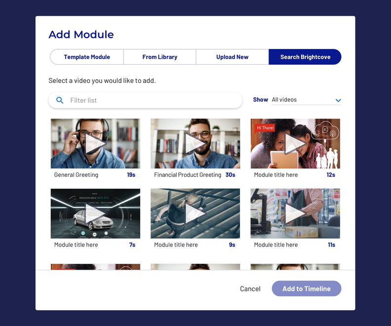 IndiVideo™ for Brightcove allows clients access their videos on Brightcove and add a layer of personalization and interactivity. Key Features: - Easy-to-use customizable pre-built video templates to reflect branding guidelines, be consistent with company messaging and in accordance with compliance guidelines - Personalize videos one to one or one to millions - Supports the stringent compliance and regulatory requirements of Financial Service companies and other heavily regulated industries
