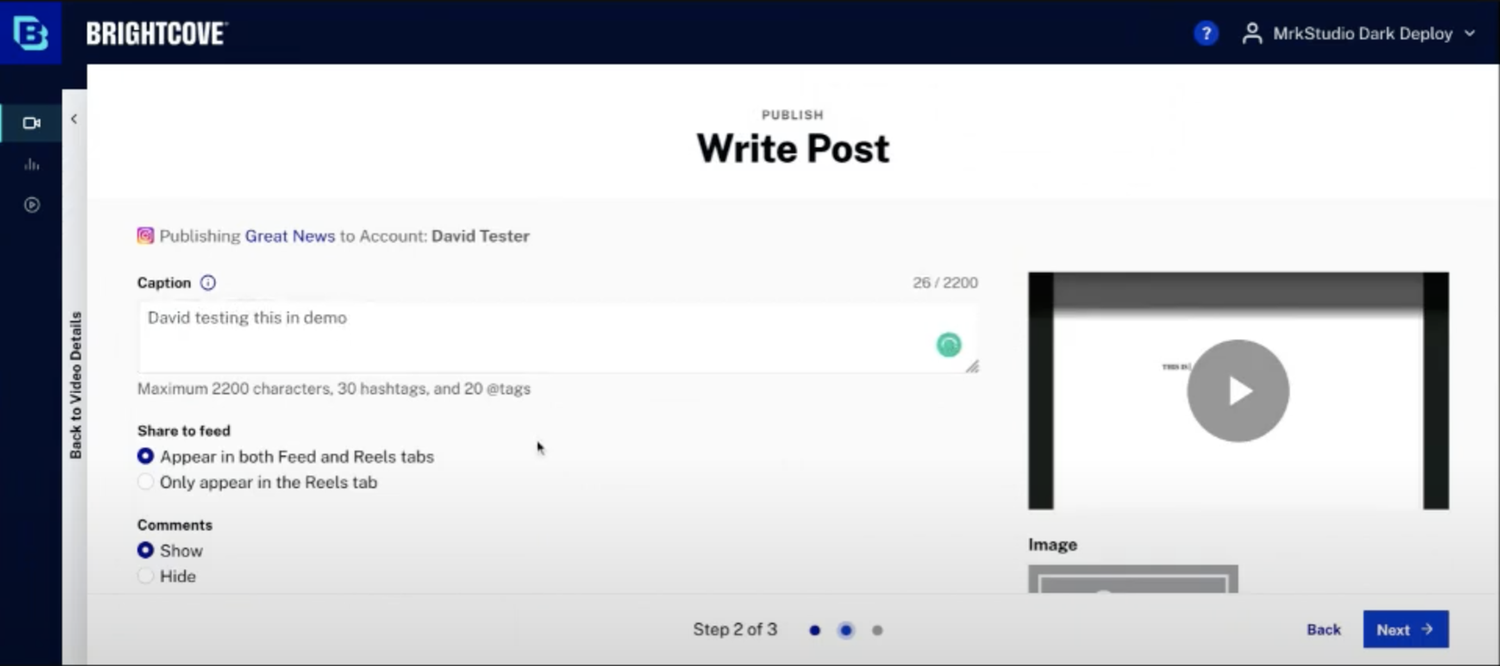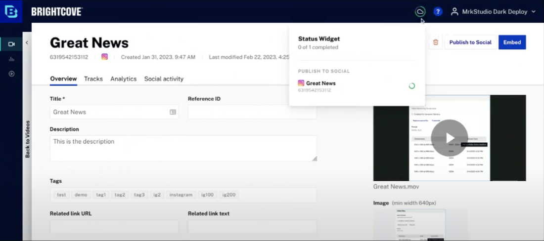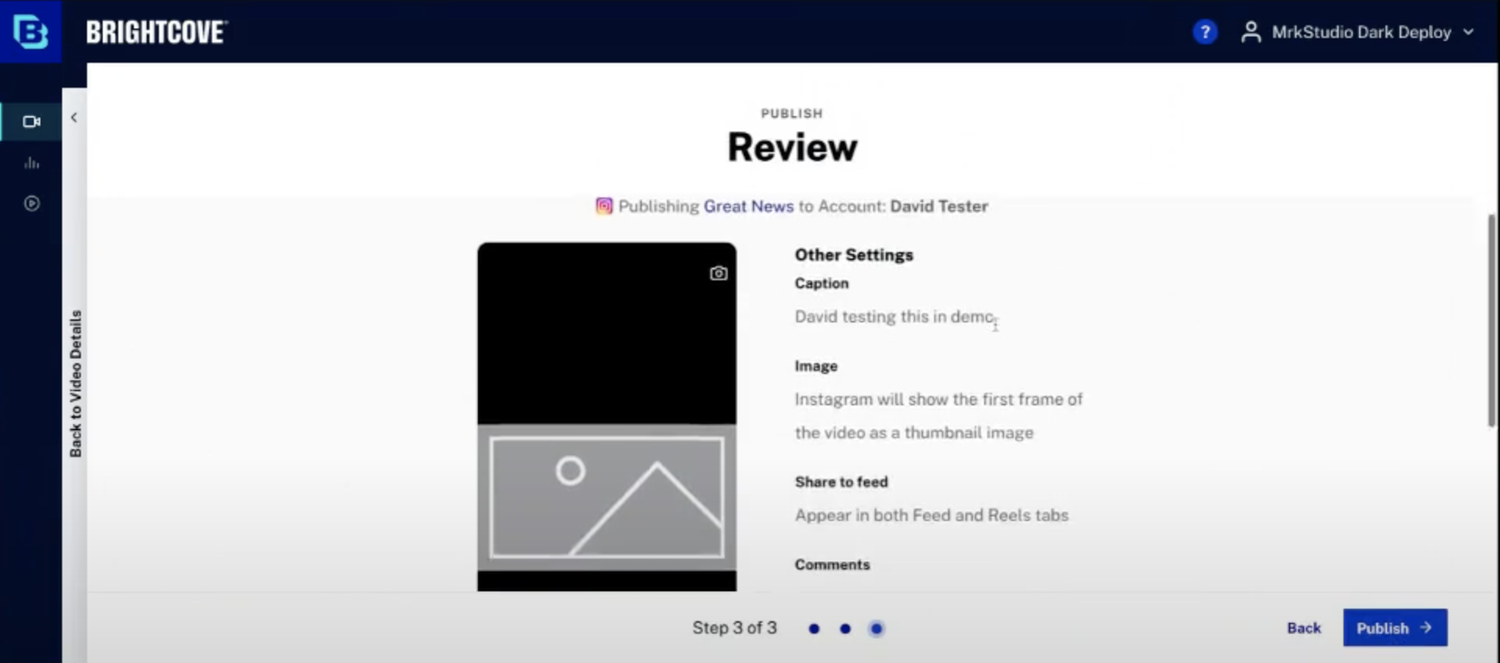 • The video published to Instagram acts as a “copy” of the original video and will not be updated when changed within the Brightcove Media library; cannot delete published posts in BCOV social UI (must be done in Instagram)