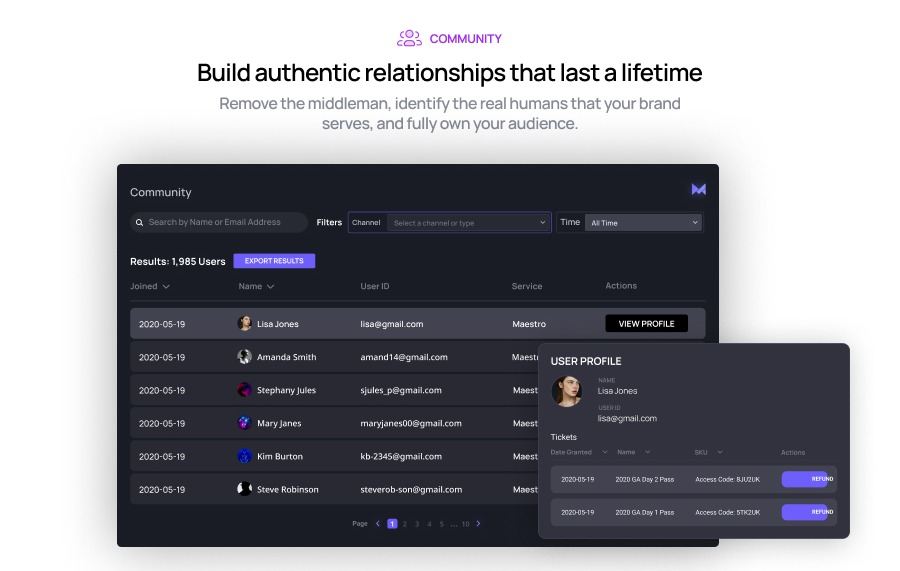Maestro is your all-in-one interactive streaming platform. Build engaging live and on-demand video experiences with brandable pages, insightful analytics, community databases, and more. Generate revenue by setting up subscription services, exclusive ticketed events, fan clubs, live shopping experiences, and interactive sponsored brand activations.