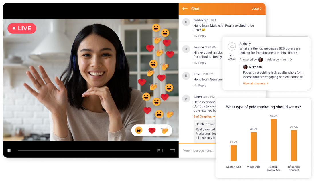 Interactive Q&A, polls, quizzes, chat, and reactions for Brightcove streams.
