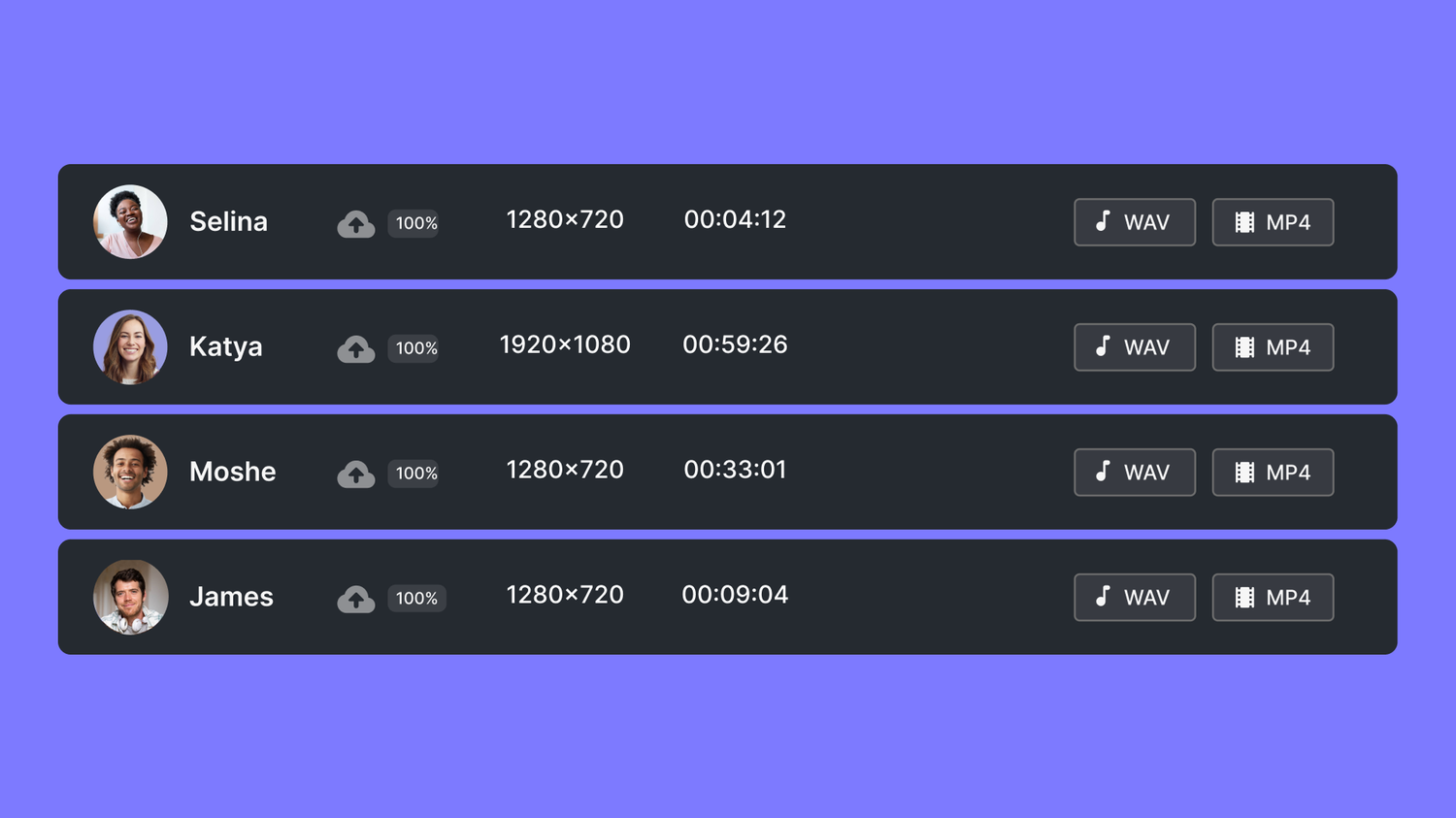 When your internet connection is poor during a call on any other platform, the recording will be choppy and pixelated. With Riverside.fm, your recordings will always be smooth and freeze-free, thanks to local recording for all participants.