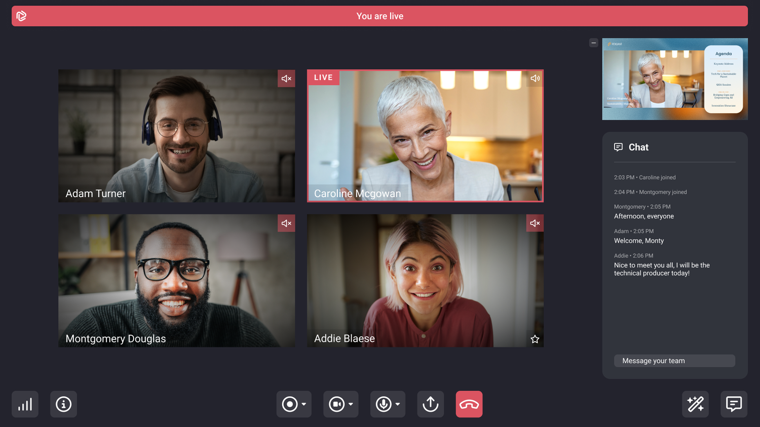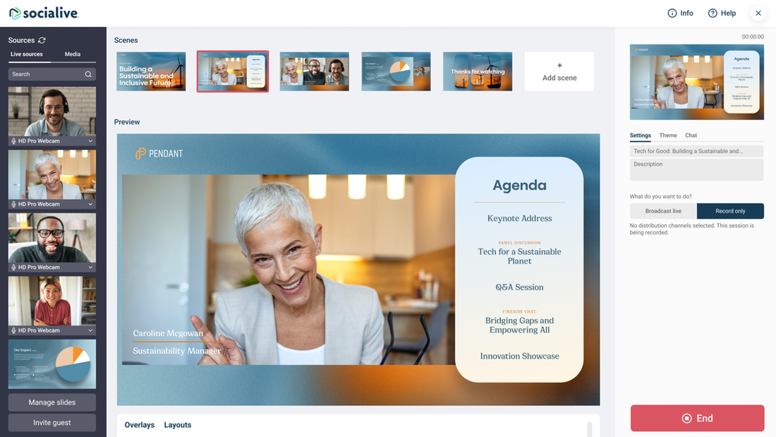With Socialive Studio, anyone can create a dynamic run of show featuring live guests, branded graphics, uploaded presentations, and pre-recorded video in dynamic layouts — complete with a Virtual Green Room.