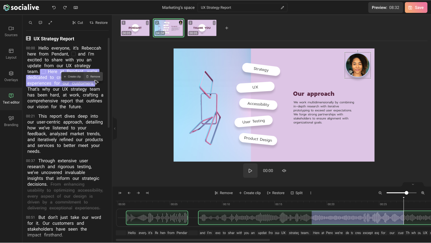 After recording from anywhere with any device, it's time to edit. Socialive’s in-platform editor makes it easy to create engaging, dynamic videos. The text-based editor, with brand controls and branded templates, makes video editing faster and easier.
