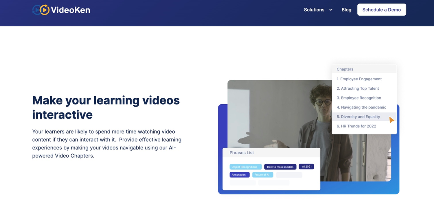 VideoKen transforms your Brightcove videos into interactive & immersive learning experiences. Leverage our auto-generated video chapters to navigate the video with ease, and identify key concepts discussed inside a video using our interactive summary. Create powerful in-video quizzes to assess learning effectiveness, or push personalized CTAs to increase engagement. Track viewers' behavior & preferences by identifying hot topics, drop-off & revisit points with our analytics.