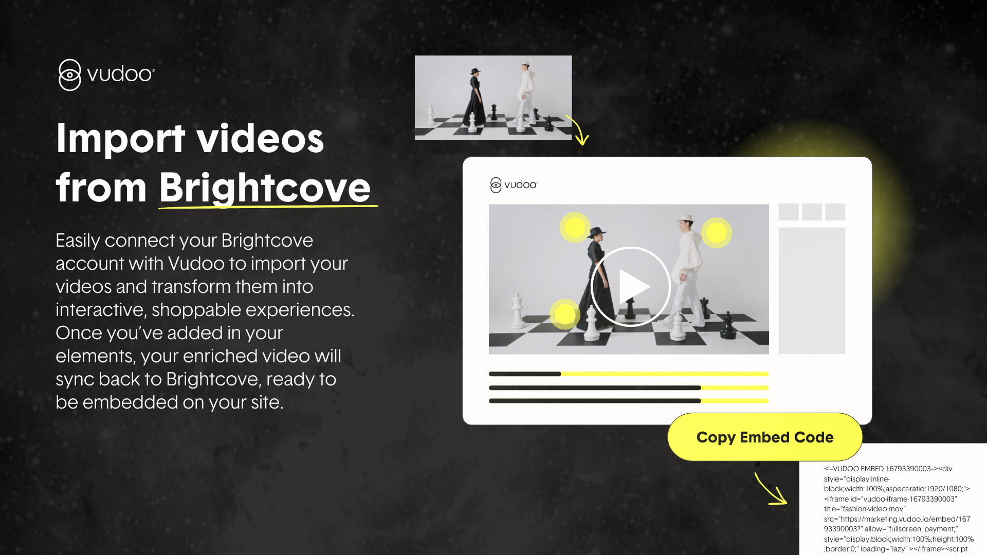 Vudoo’s integration imports your videos from Brightcove directly to the Vudoo platform. There, you can enhance your video with interactive elements such as buttons, forms, product catalogs, checkout pages, and personalized storylines. Once your interactions or shoppable features are added, the video syncs back to the Brightcove player, ready to be embedded on your site.